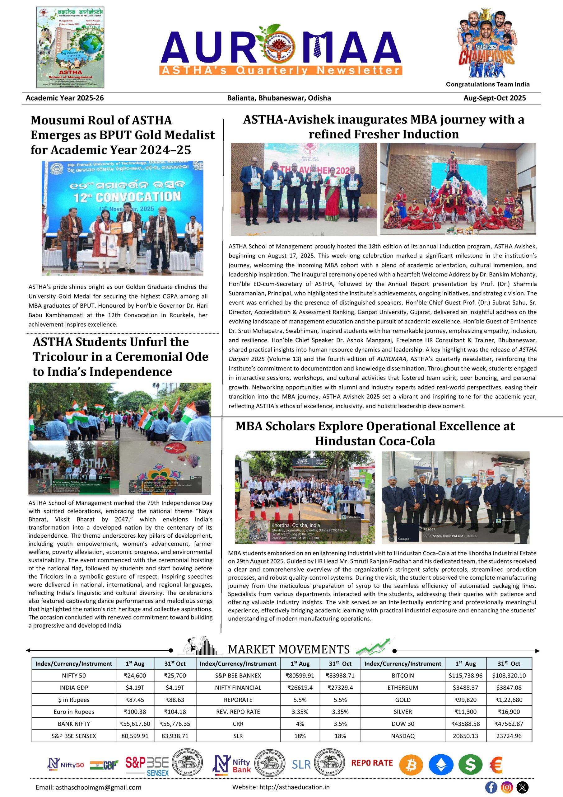 At ASTHA School of Management, we believe that true education transcends the boundaries of textbooks and classrooms; it is about nurturing hearts and minds. Just as the aroma can intoxicate and captivate senses. The essence of our management education spreads the fragrance of love, unity, and humanity. It is the aroma that defines who we are and how we shape future leaders. Aroma, the fragrance of our institution, symbolizes the values we uphold: selfless service, societal growth, and a relentless pursuit of excellence. Our primary purpose is not just to impart knowledge but to ignite the flame of compassion and creativity in the hearts of our students, empowering them to become catalysts for change. Through quality management education, we are fostering a culture where leadership is not about authority but about serving others with integrity, wisdom, and empathy. Every activity, every lesson at ASTHA, is designed with a purpose to shape the minds of young leaders who will drive innovation, inclusivity, and progress for the well-being of society and the nation. The journey we embark on together is one of transformation from students to leaders, from individuals to global citizens. As we launch the first edition of AUROMAA, our quarterly newsletter, we invite you to witness the vibrant journey of ASTHA. It is a journey filled with purpose, passion, and promise. Together, we will continue to inspire, educate, and empower, making the world a better place, one step at a time. Let the fragrance of ASTHA’s vision and values inspire you, as we embrace a future filled with hope and endless possibilities.
