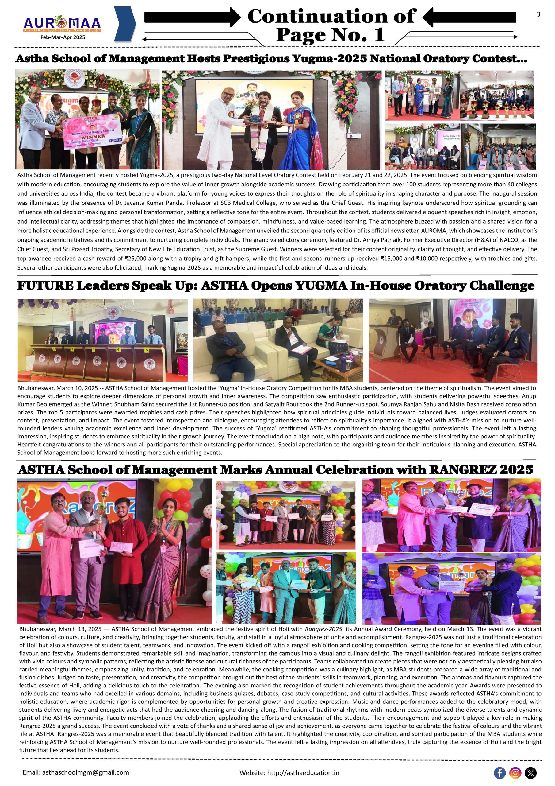 At ASTHA School of Management, we believe that true education transcends the boundaries of textbooks and classrooms; it is about nurturing hearts and minds. Just as the aroma can intoxicate and captivate senses. The essence of our management education spreads the fragrance of love, unity, and humanity. It is the aroma that defines who we are and how we shape future leaders. Aroma, the fragrance of our institution, symbolizes the values we uphold: selfless service, societal growth, and a relentless pursuit of excellence. Our primary purpose is not just to impart knowledge but to ignite the flame of compassion and creativity in the hearts of our students, empowering them to become catalysts for change. Through quality management education, we are fostering a culture where leadership is not about authority but about serving others with integrity, wisdom, and empathy. Every activity, every lesson at ASTHA, is designed with a purpose to shape the minds of young leaders who will drive innovation, inclusivity, and progress for the well-being of society and the nation. The journey we embark on together is one of transformation from students to leaders, from individuals to global citizens. As we launch the first edition of AUROMAA, our quarterly newsletter, we invite you to witness the vibrant journey of ASTHA. It is a journey filled with purpose, passion, and promise. Together, we will continue to inspire, educate, and empower, making the world a better place, one step at a time. Let the fragrance of ASTHA’s vision and values inspire you, as we embrace a future filled with hope and endless possibilities.