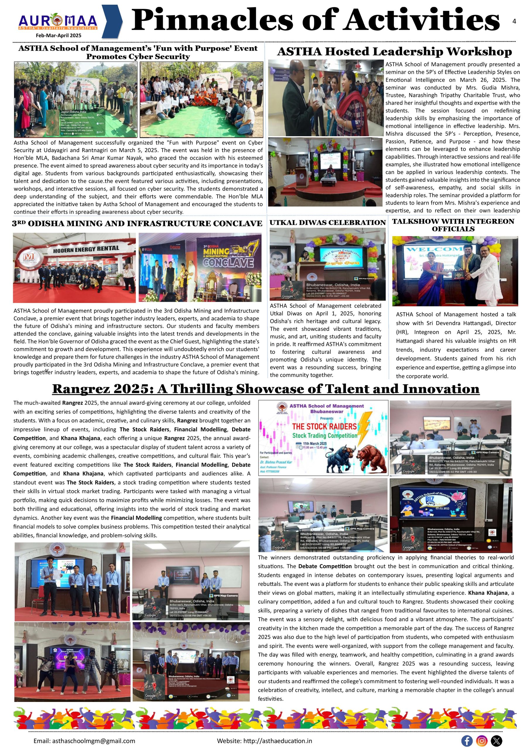 At ASTHA School of Management, we believe that true education transcends the boundaries of textbooks and classrooms; it is about nurturing hearts and minds. Just as the aroma can intoxicate and captivate senses. The essence of our management education spreads the fragrance of love, unity, and humanity. It is the aroma that defines who we are and how we shape future leaders. Aroma, the fragrance of our institution, symbolizes the values we uphold: selfless service, societal growth, and a relentless pursuit of excellence. Our primary purpose is not just to impart knowledge but to ignite the flame of compassion and creativity in the hearts of our students, empowering them to become catalysts for change. Through quality management education, we are fostering a culture where leadership is not about authority but about serving others with integrity, wisdom, and empathy. Every activity, every lesson at ASTHA, is designed with a purpose to shape the minds of young leaders who will drive innovation, inclusivity, and progress for the well-being of society and the nation. The journey we embark on together is one of transformation from students to leaders, from individuals to global citizens. As we launch the first edition of AUROMAA, our quarterly newsletter, we invite you to witness the vibrant journey of ASTHA. It is a journey filled with purpose, passion, and promise. Together, we will continue to inspire, educate, and empower, making the world a better place, one step at a time. Let the fragrance of ASTHA’s vision and values inspire you, as we embrace a future filled with hope and endless possibilities.