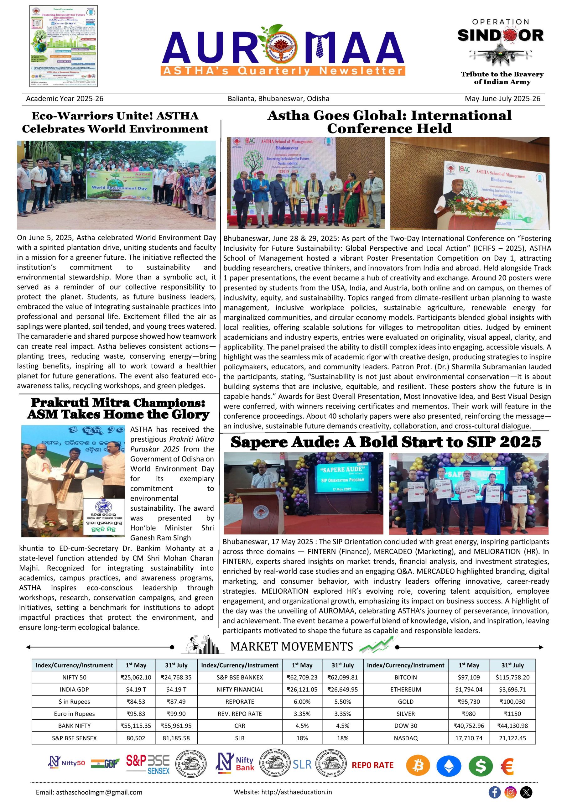 At ASTHA School of Management, we believe that true education transcends the boundaries of textbooks and classrooms; it is about nurturing hearts and minds. Just as the aroma can intoxicate and captivate senses. The essence of our management education spreads the fragrance of love, unity, and humanity. It is the aroma that defines who we are and how we shape future leaders. Aroma, the fragrance of our institution, symbolizes the values we uphold: selfless service, societal growth, and a relentless pursuit of excellence. Our primary purpose is not just to impart knowledge but to ignite the flame of compassion and creativity in the hearts of our students, empowering them to become catalysts for change. Through quality management education, we are fostering a culture where leadership is not about authority but about serving others with integrity, wisdom, and empathy. Every activity, every lesson at ASTHA, is designed with a purpose to shape the minds of young leaders who will drive innovation, inclusivity, and progress for the well-being of society and the nation. The journey we embark on together is one of transformation from students to leaders, from individuals to global citizens. As we launch the first edition of AUROMAA, our quarterly newsletter, we invite you to witness the vibrant journey of ASTHA. It is a journey filled with purpose, passion, and promise. Together, we will continue to inspire, educate, and empower, making the world a better place, one step at a time. Let the fragrance of ASTHA’s vision and values inspire you, as we embrace a future filled with hope and endless possibilities.